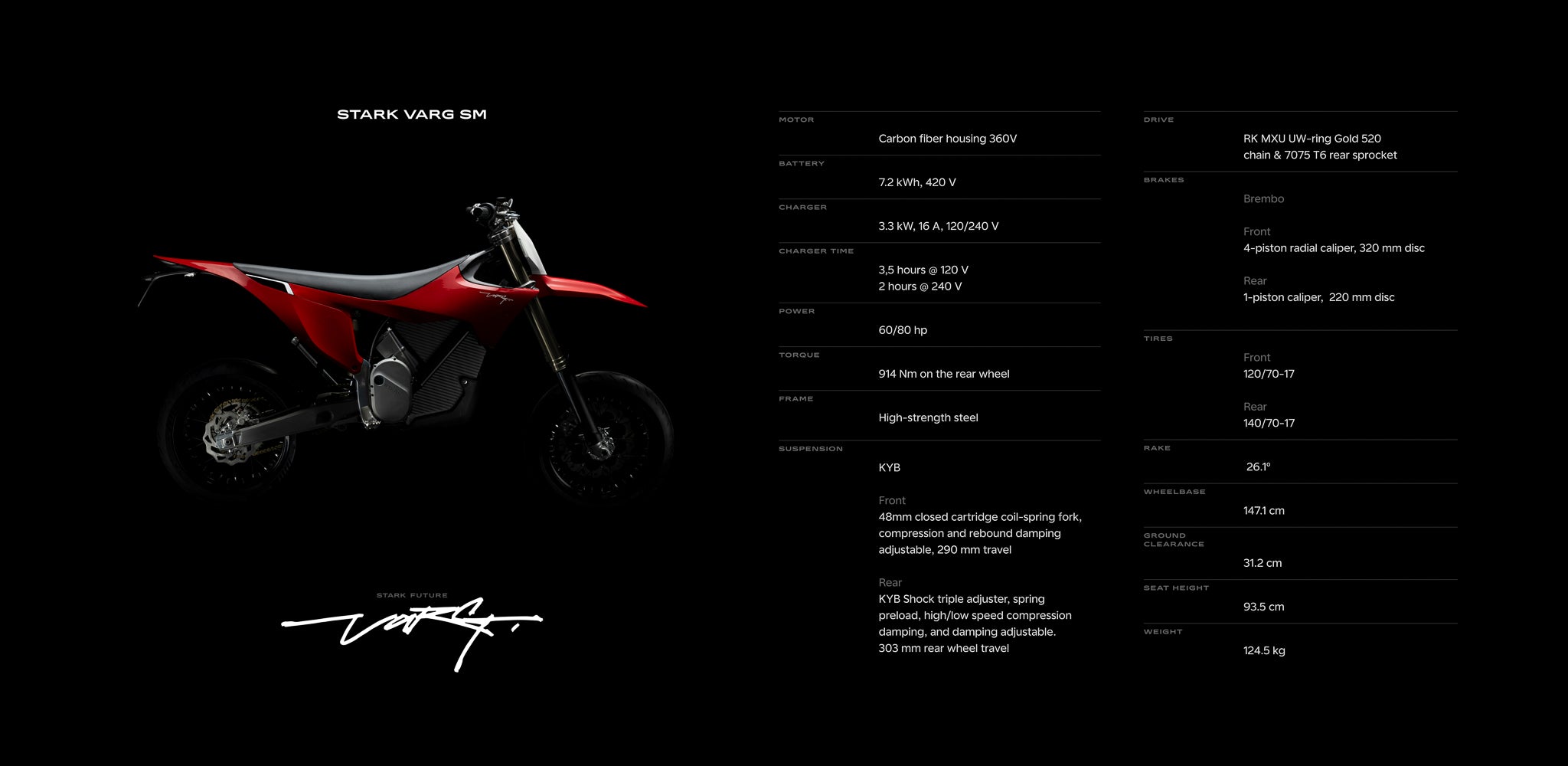 Powered by a 7.2kWh battery, a motor delivering 80HP with instant response and a mixed urban riding range of 73 miles, the VARG SM is engineered for limitless rides.